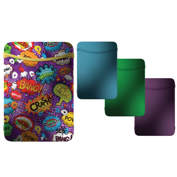 Summon your sense of humor with our fun comic book print. This bold pattern combines with bright teal, green and grape, creating a look your inner superhero can’t live without.